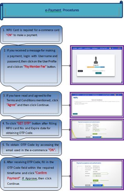 | အဆင့်(၁) | ငွေပေးသွင်းရန်အတွက် MPU Card အား သက်ဆိုင်ရာ ဘဏ်တွင် e-Commerce "On" ထားသည့် ကတ် ဖြစ်ရန် လိုအပ်ခြင်း၊ |